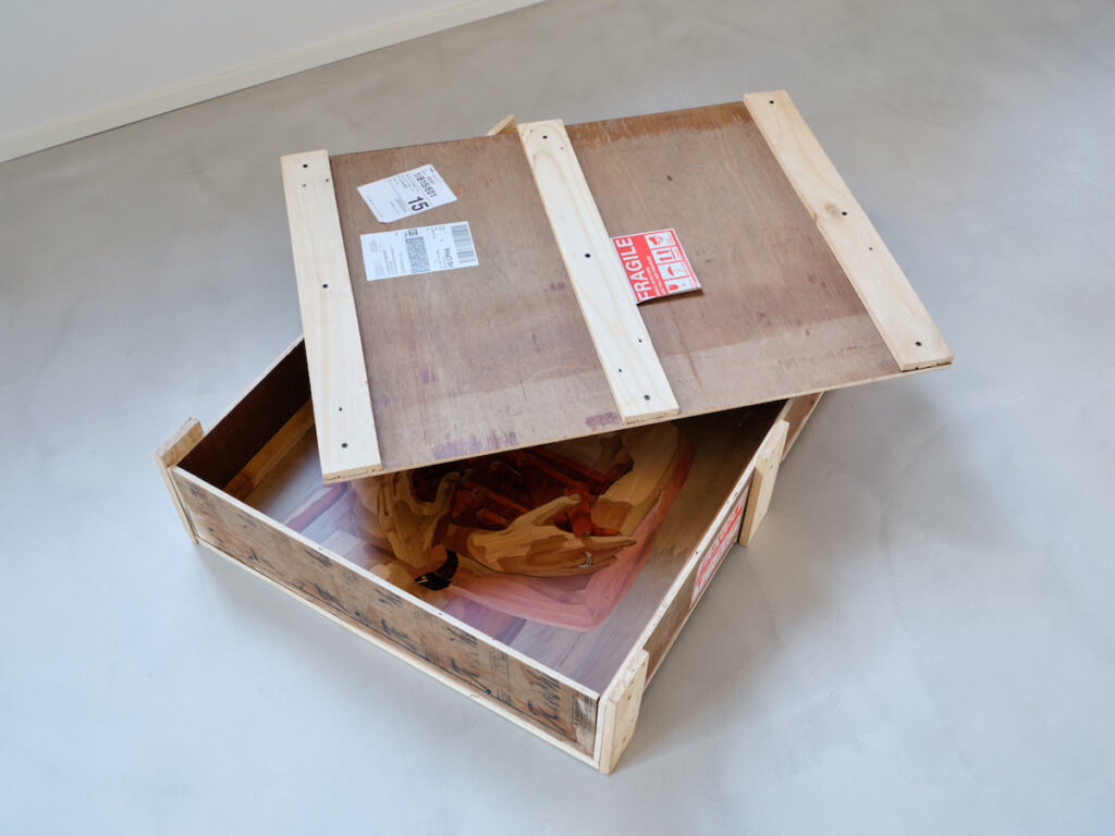 GT: Il comfort circola dentro protocolli, standard, infrastrutture, e per mantenersi ha bisogno di regole, selezioni, consumi, lavoro, trasporto. In Just-in-time un trasportino per voli aerei destinato al cane Patrick diventa la forma estrema di una cura regolata: per permettere a una relazione interspecie di viaggiare, tutto deve rientrare in misure, norme e condizioni precise. Accanto all’oggetto trovato, la replica in vetro colorato incrina questa rigidità e trasforma etichette e griglie in elementi quasi ornamentali. In Smooth Operator compare invece un ambiente a temperatura controllata in cui umani, piante e animali condividono un benessere organizzato. L’immagine nasce da un’intelligenza artificiale e viene poi tradotta in un intarsio di legno di Mysore. Anche qui il punto è lo scarto: tra rapidità algoritmica e lentezza del manufatto, tra calore artificiale e calore materico, tra un’idea di armonia perfetta e i dispositivi che la rendono possibile. Quello che la mostra mette in crisi è proprio la fantasia di un benessere fluido, neutrale, disponibile per tutti allo stesso modo. Il comfort non è mai solo una sensazione. È una costruzione politica e materiale. Ha a che fare con chi viene accolto, chi resta fuori, quali corpi possono circolare, quali relazioni possono essere sostenute, quale lavoro invisibile tiene in piedi l’intero insieme. In questo senso Villiam non rifiuta il comfort: lo apre, lo complica, lo espone alle sue contraddizioni.