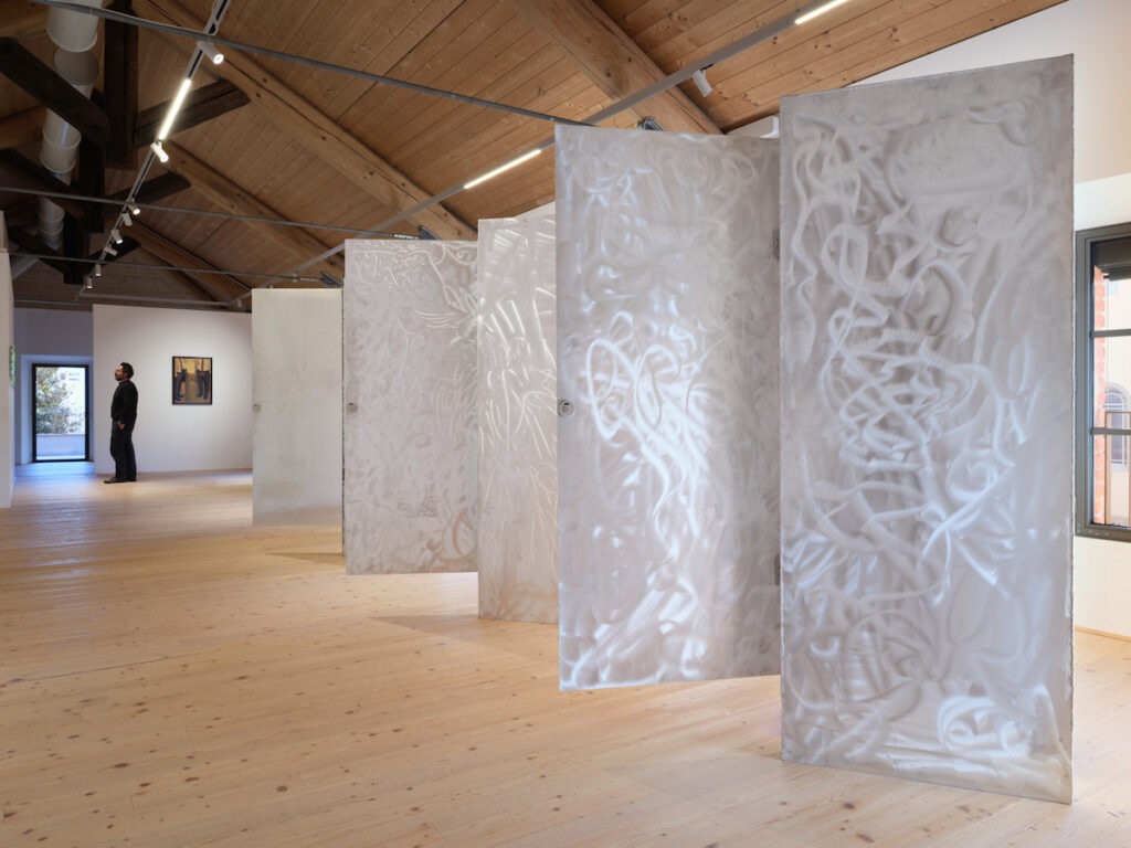 EB: Nei piani superiori, tra opere e installazioni, la mostra oscilla tra poli opposti, tra protezione ed esposizione, intimità e servizio. Mi introduci questa parte espositiva approfondendo i temi affrontati dall’artista?