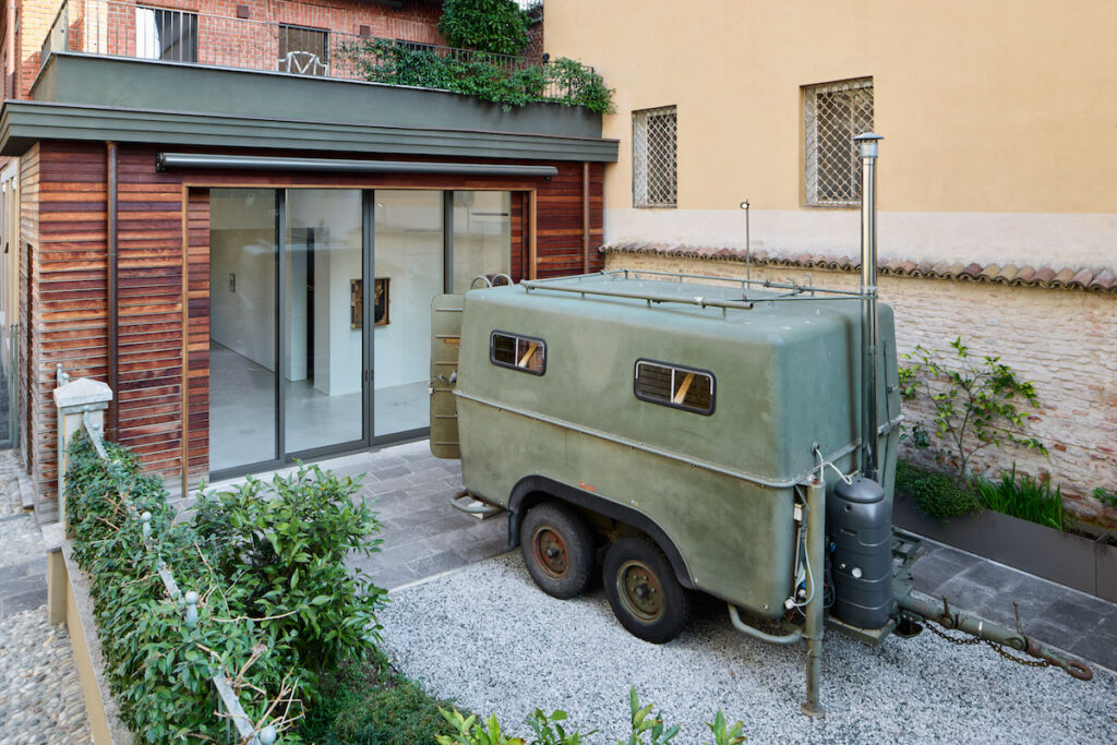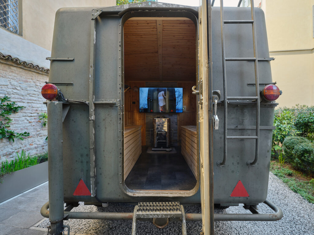Abbiamo chiesto al curatore di Smooth Operetor, Gabriele Tosi, di guidarci sui tanti significati e riflessioni compiute da Villiam Miklos Andersen in occasione della mostra, partendo dalla prima opera che accoglie i visitatori, un veicolo post-bellico trasformato dall’artista in una sauna mobile.