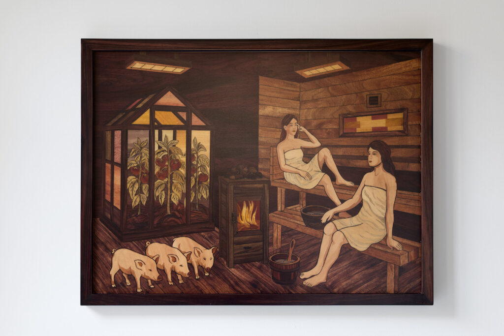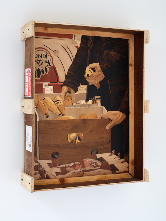 GT: Andersen indaga i sistemi economici contemporanei partendo da oggetti e luoghi molto concreti. In Water Sports una fila di orinatoi da area di servizio viene tradotta in legno; nello spazio normalmente destinato alla pubblicità compare la sequenza di una nave cargo che entra e esce dal fiordo di Narvik. Il lavoro mette in relazione bisogno fisiologico, trasporto, estrazione e desiderio, mostrando che corpo e logistica abitano lo stesso campo. In Transactions l’artista entra invece nel mercato di Rungis, alle porte di Parigi, dove ogni giorno tonnellate di merci vengono comprate, vendute e distribuite. In un luogo dominato dalla velocità e dalla quantità, Andersen si concentra sulle mani che lavorano. Cinque fotografie diventano intarsi realizzati a Mysore, in India (con Dayananda Nagaraju), attraverso un processo lentissimo che richiede circa un mese per ogni immagine. Anche qui la sua prospettiva è molto chiara: non separa mai desiderio, lavoro, corpo e infrastruttura. Li rimette in contatto, e soprattutto altera il ritmo del sistema introducendo lentezza, attenzione, tatto.