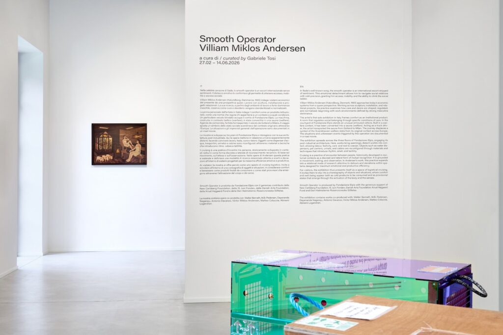 Il titolo della mostra prende ispirazione da una celebre canzone degli anni ’80 di Sade, ‘smooth operator’: in inglese descrive una persona affascinante, sicura di sé, abile nel raggiungere i propri scopi con astuzia e charme, talvolta in modo manipolatorio o subdolo. Senza scrupoli e impassibile emotivamente, la figura di un escort senza sentimenti sembra affascinare l’artista Villiam Miklos Andersen, protagonista della mostra in corso fino al 14 giugno alla Fondazione Elpis di Milano. Ospitata negli spazi espositivi della Lavanderia, la mostra riunisce opere che indagano il concetto di comfort come prodotto istituzionale: una condizione che regola chi appartiene a un contesto e a quali condizioni. Il percorso interroga i costi emotivi del mantenimento, della protezione e della circolazione del benessere, trasformando l’architettura della Fondazione in una sequenza di spazi con funzioni diverse.