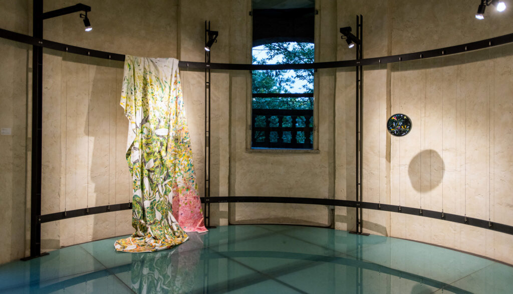 L’artista torinese Elisa Filomena, con la sua grande installazione pittorica, evoca uno spazio scenografico antico e sacrale, in cui uomo e natura sono legati da una relazione inscindibile. Le sue opere, poste su un fondale di juta, la cui materia rimanda all’umiltà del saio francescano, si dilatano per diversi metri creando una sorta di abbraccio visivo in cui l’essere umano e la natura sono strettamente legati senza discontinuità. Elisa Filomena racconta che “l’installazione semicircolare raccoglie dipinti che esprimono il senso di appartenenza alla natura che sento profondamente e che, in certi momenti, affiora con forza dentro di me. In questo luogo unico e prezioso che è il Sacro Monte di Orta, quei momenti sono raccolti insieme in un’unica installazione che rappresenta, nello scorrere del tempo, l’attimo in cui questo sentire è emerso e si è manifestato in pittura.”