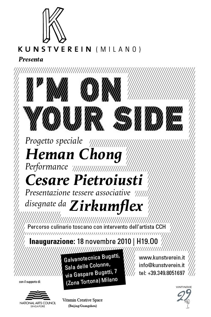 La mostra ha per titolo I am On Your Side e ha per protagonista Heman Chong con un progetto speciale. Nella serata inaugurale anche una performance di Cesare Pietroiusti.